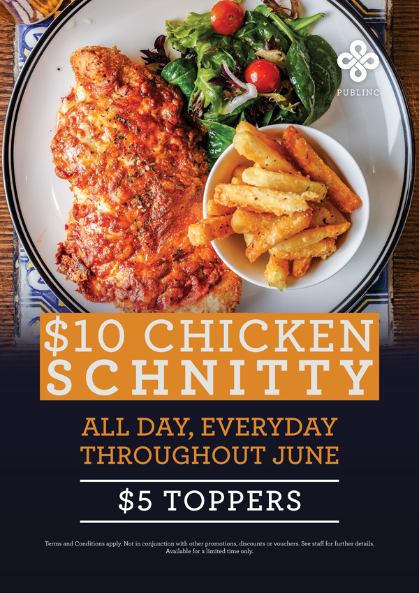 DETAILS: A promotional offer of $10 Schnitzels throughout June will drive food sales for your venue. It is suggested that you run this offer all day, every day throughout June. However, if you wish to limit this to certain days or offer a different price point (provided it is still attractive to your customers) this should be included in your promotion proposal. This provides a great opportunity for venues to upsell $5 toppers and to convert customers to ongoing buyers following the end of the promotion.
