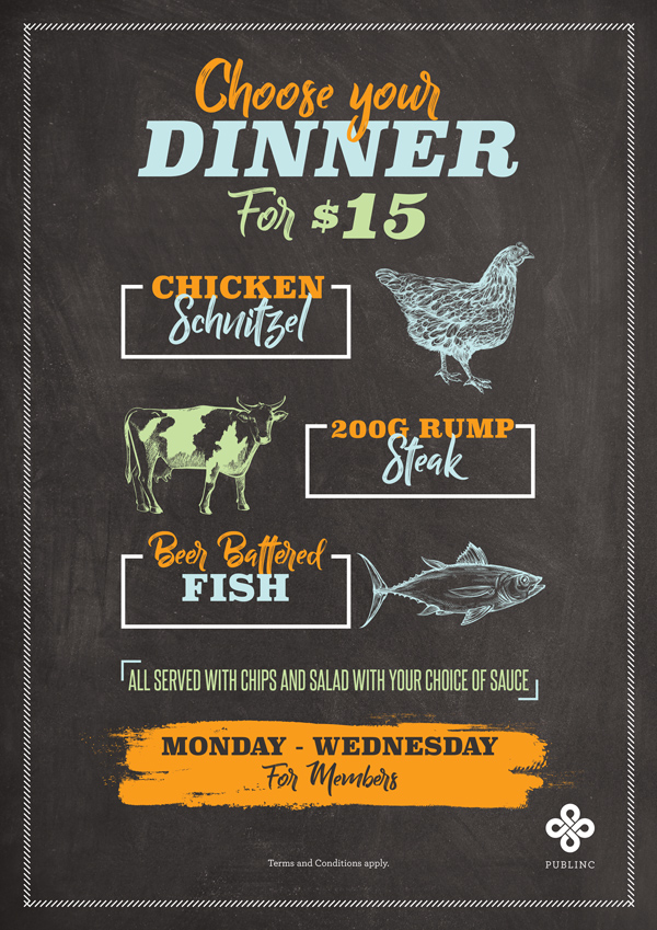 DETAILS: A promotional offer of $15 Classics (Fish, Steak and Schnitzel) provides affordable meals for your customers. The value deal will encourage patrons to your hotel for affordable dining with family and friends and will increase foot traffic and positive word of mouth. It is suggested that you run this Monday- Wednesday for lunch and dinner trade periods throughout June. If you wish to run this different days/times, please include this in your promotion proposal.