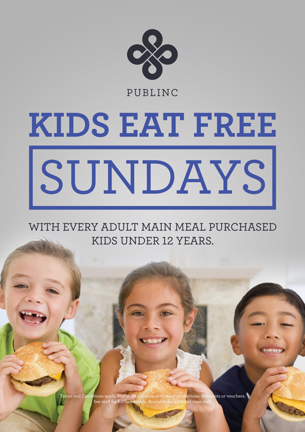 DETAILS: Every Sunday, for both lunch and dinner trade periods, Kids Eat Free with the purchase of a main meal. This is limited to one kids’ meal per main.