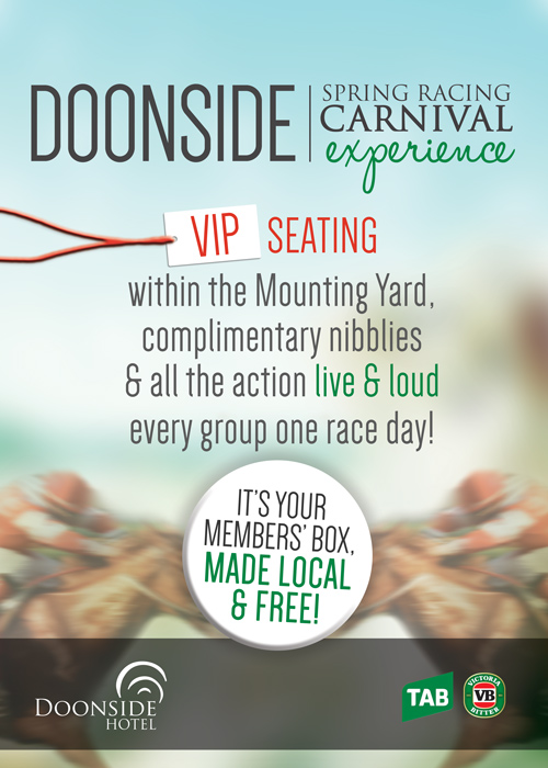 DETAILS: Provide your customers with a racing experience superior to your competitors, by bringing the trackside atmosphere to them. Look to create a Spring Racing pop-up zone in your TAB area, where customers can enjoy priority, comfortable seating, complimentary premium finger food, table service, prime view of the TVs showing the racing and some additional theming and decorations to enhance to races atmosphere, every Group 1 race day.
