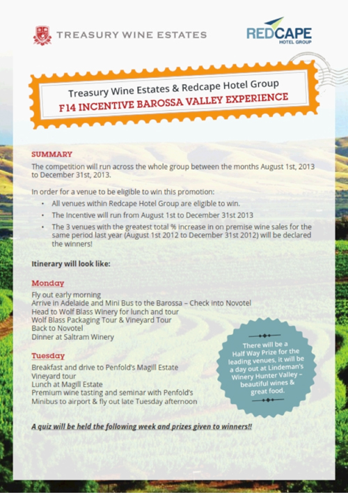 Redcape venues will run a Treasury Wine Estates feature wine program centralised around 3 key wine selling months: August, November & December.