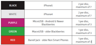 The Discgo Charger is compatible with the following phone devices and comes with colour coded cables per the below;