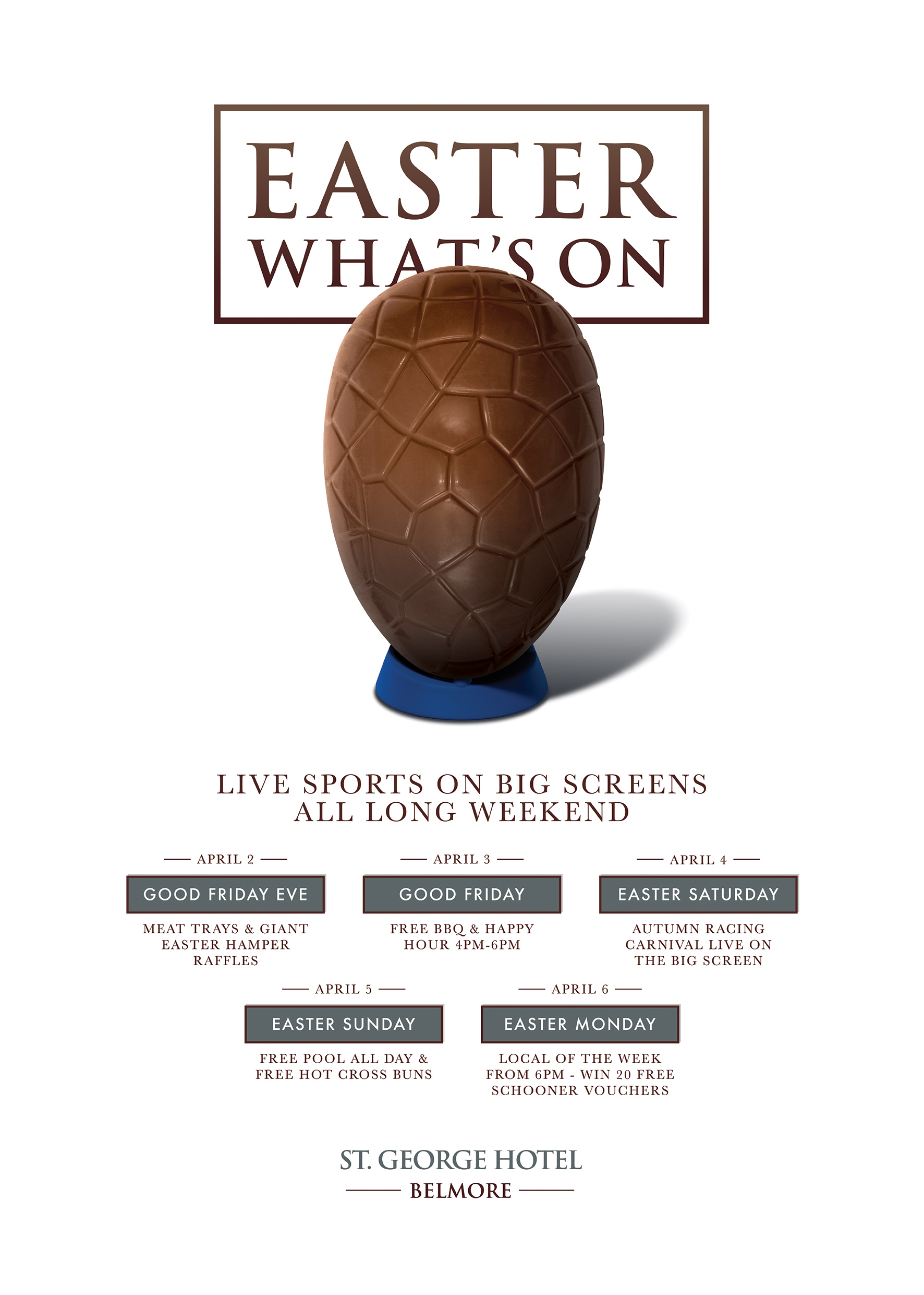 DETAILS: There is a great sports schedule across the Easter long weekend. For Strong sports-focused venues, it will be appropriate to focus on this schedule to drive customers to your venue, whilst also focusing on the great facilities you may have, such as large screens, complimentary snacks, platinum TAB etc.