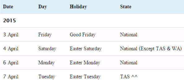 In 2015, Easter will be celebrated with the Good Friday holiday on 3 April and Easter Monday holiday on 6 April to create a 4-day long weekend. This is the biggest and most anticipated long weekend of the year.
