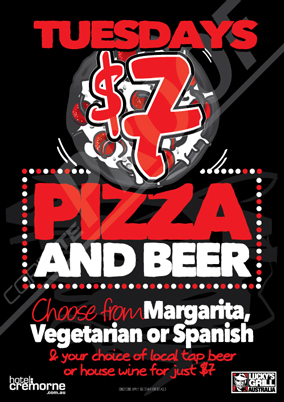 Choose from Spanish, Margarita or Vegetarian Pizza plus your choice of local beer or house wine for just $7.