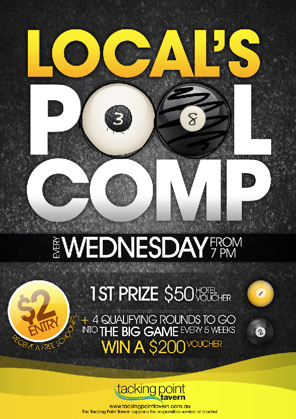 A pool competition is design to encourage patronage to your venue mid week. This promotion will also encourage extended patronage on the night for the duration of the competition and beyond. The promotion will establish your venue as a good local destination for a relaxed game of pool and cold beer.